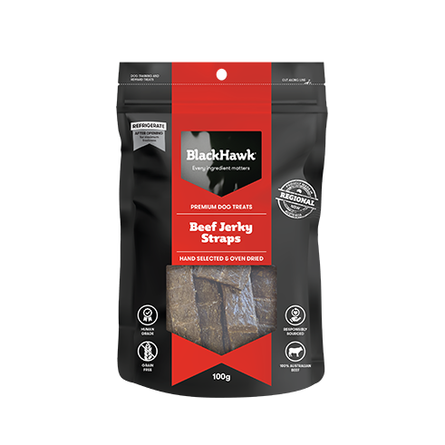 Black Hawk Beef Jerky Straps are approximately 80mm long and 15mm wide. The result is a high-quality treat ideal for medium to large dogs over 12 months of age.