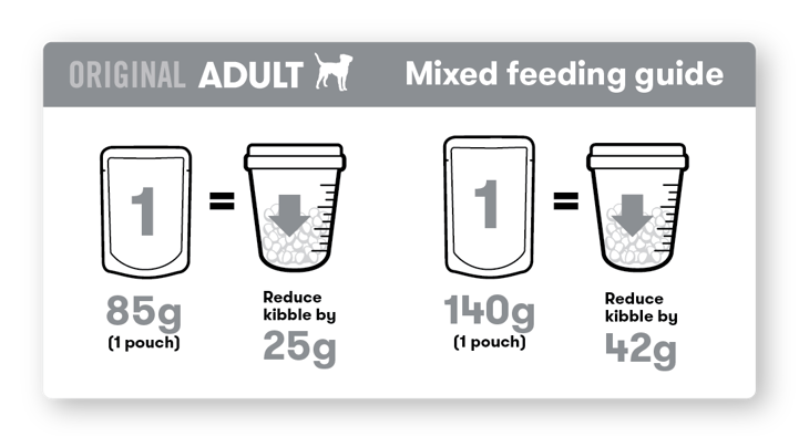 If using 85g pouches, for each pouch per day we recommend reducing the amount of dry food per day by 25g.
