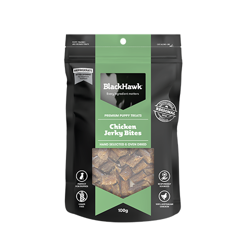 Black Hawk Puppy Chicken Jerky Bites are approximately 20mm long and 8-10mm thick and can be pulled apart to suit small puppies needs as required. The result is a high-quality treat ideal for puppy training reward.