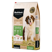 The amount of food your pet needs will vary depending on their age, weight, lifestyle and breed. Black Hawk pet foods come with a feeding guide which will offer a recommended serving size for your dog.